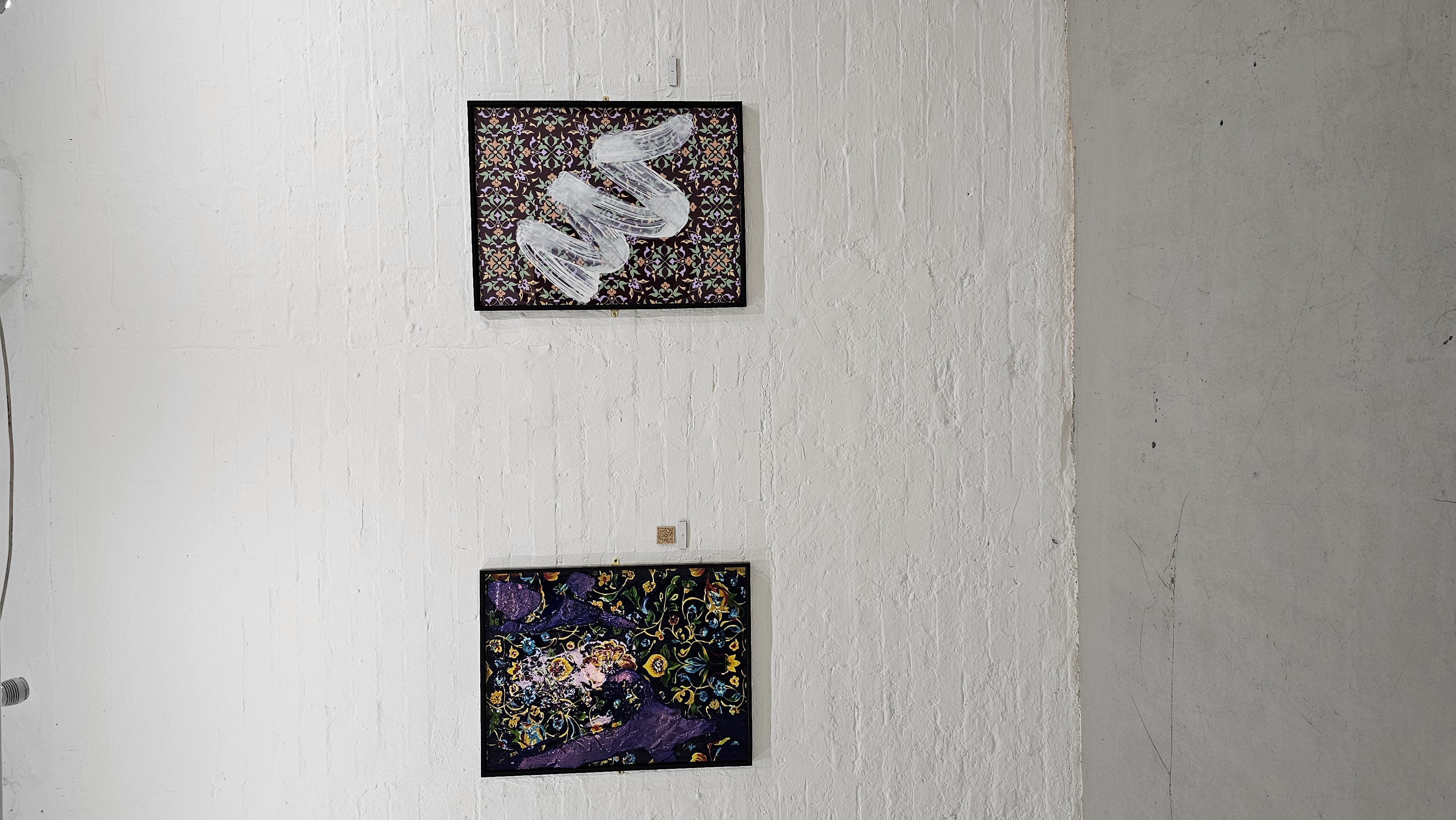 Overlaying this delicate and controlled pattern is a dramatic intervention: thick, jagged forms of plaster, painted in shades of metallic lavender, amethyst, and deep violet, appear to slice through the floral design with palpable force. These textured forms, applied with an almost sculptural physicality, suggest the fragmented remains of letters or calligraphic marks, as though language itself has been broken or eroded. The surfaces are rough and irregular, forming a stark contrast with the refined elegance of the painted florals beneath. The entire piece is coated in resin, which lends a glossy, reflective surface—further intensifying the contrast between the two visual languages at play. The floral patterns shimmer beneath the resin like something preserved or fossilised, while the plaster elements rupture that stillness, protruding like scars across a once-pristine surface. This juxtaposition between the traditional and the fractured, the decorative and the disrupted, invites reflection on themes such as cultural memory, identity, and erasure. The Mughal motifs may represent a lineage of history and beauty, but the intrusion of the obliterated text-like forms suggests interference, loss, or even resistance. The viewer is left to navigate the tension between preservation and destruction, ornament and meaning, harmony and chaos. This artwork, though deeply rooted in historical visual culture, feels wholly contemporary in its execution and conceptual undertone—a powerful meditation on the fragmentation of heritage and the complexities of postcolonial identity. |
